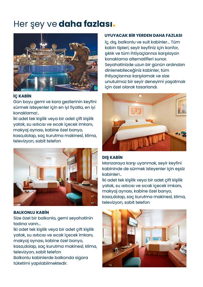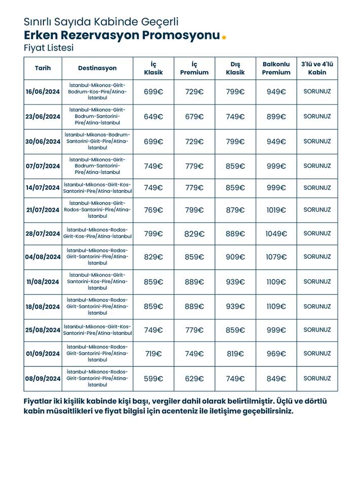 Ege'nin en güzel limalarını İstanbul'dan hareketle keşfedin! Her gün yeni bir limanda uyanın. Eşsiz bir gemi seyahati için en uygun konaklamayla eşşiz bir tatil yaşayın.